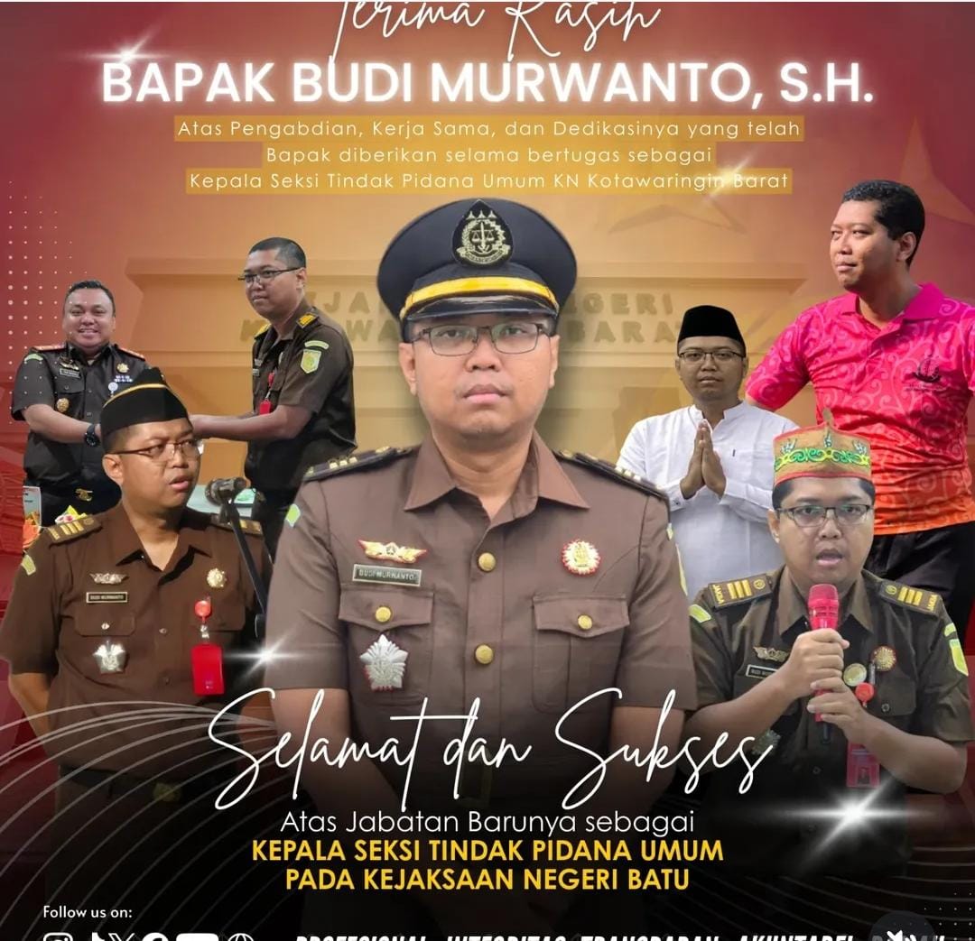 Keluarga Besar Kejaksaan Negeri Kotawaringin Barat juga menyampaikan ucapan selamat dan sukses atas amanah serta jabatan baru yang diemban oleh Bapak Budi Murwanto, S.H. sebagai Kepala Seksi Tindak Pidana Umum pada Kejaksaan Negeri Batu. Diharapkan, kepercayaan yang diberikan tersebut dapat dijalankan dengan penuh tanggung jawab serta membawa manfaat bagi institusi dan masyarakat.
