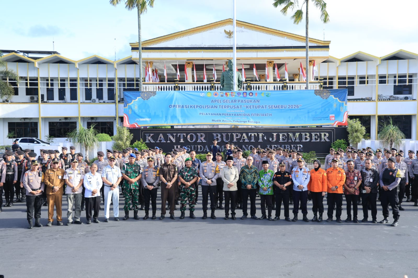 Jember,pusatberita.i-news.site – Pemerintah Kabupaten Jember bersama unsur TNI dan Polri resmi memulai pengamanan perayaan Idul Fitri melalui Apel Gelar Pasukan Operasi Kepolisian Terpusat “Ketupat Semeru 2026” yang digelar di Alun-Alun Jember pada Kamis (12/3/2026).