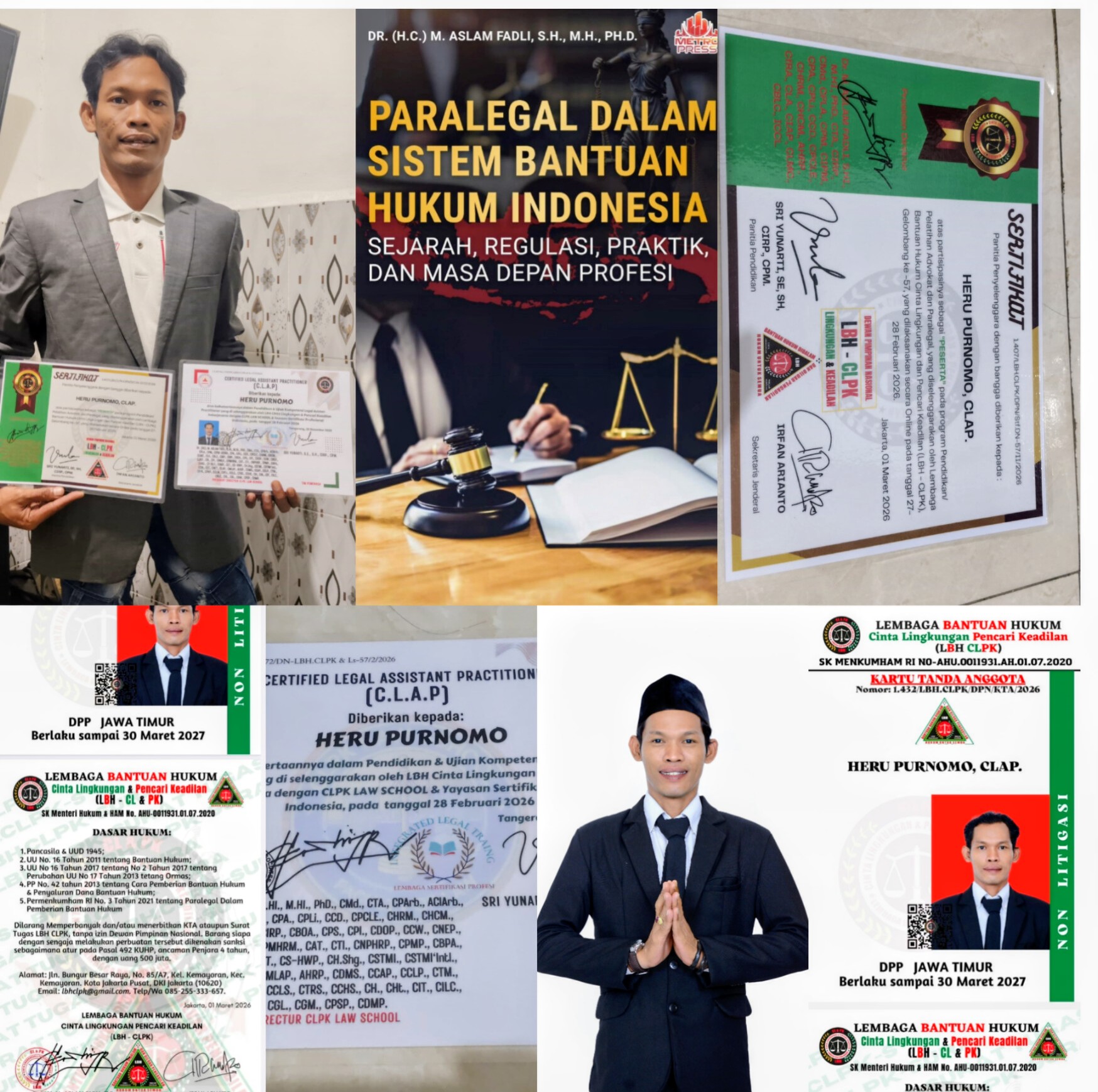 Sidoarjo//Pusatberita.i.news.Site Semangat untuk memperjuangkan keadilan bagi masyarakat kembali ditunjukkan oleh Heru Purnomo. Ia kini resmi mengantongi sertifikat Paralegal CLAP (Certified Legal Assistance Program) dan bergabung dalam jajaran Lembaga Bantuan Hukum CLPK (LBH CLPK) yang dipimpin oleh tokoh hukum nasional, Dr. (H.C) M. Aslam Fadli, S.H., M.H., Ph.D..