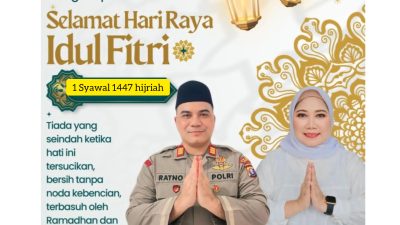 Kotawaringin Barat Pusatberita iNews – Menyambut Hari Raya Idul Fitri 1447 H/2026 M, Kapolsek Arut Selatan AKP Ratno, S.H., M.M. bersama Ketua Bhayangkari Ranting Arut Selatan Ny. Yuyun Ratno menyampaikan ucapan selamat kepada seluruh masyarakat. Rabu (18/03/2026).