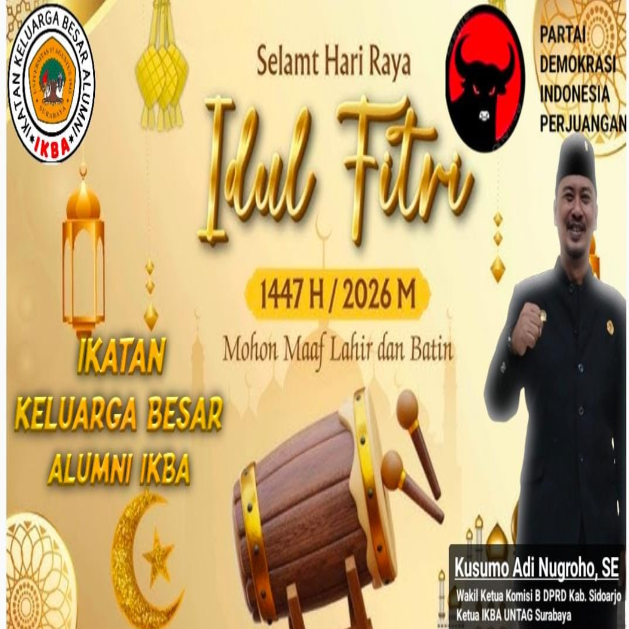 SIDOARJO//Pusatberita.i.news.SiteDalam suasana penuh kebahagiaan menyambut Hari Raya Idul Fitri 1447 Hijriah, Wakil Ketua Komisi B DPRD Kabupaten Sidoarjo sekaligus Ketua IKBA UNTAG Surabaya, Kusumo Adi Nugroho, SE, menyampaikan ucapan selamat yang sarat makna dan harapan bagi seluruh umat Muslim.