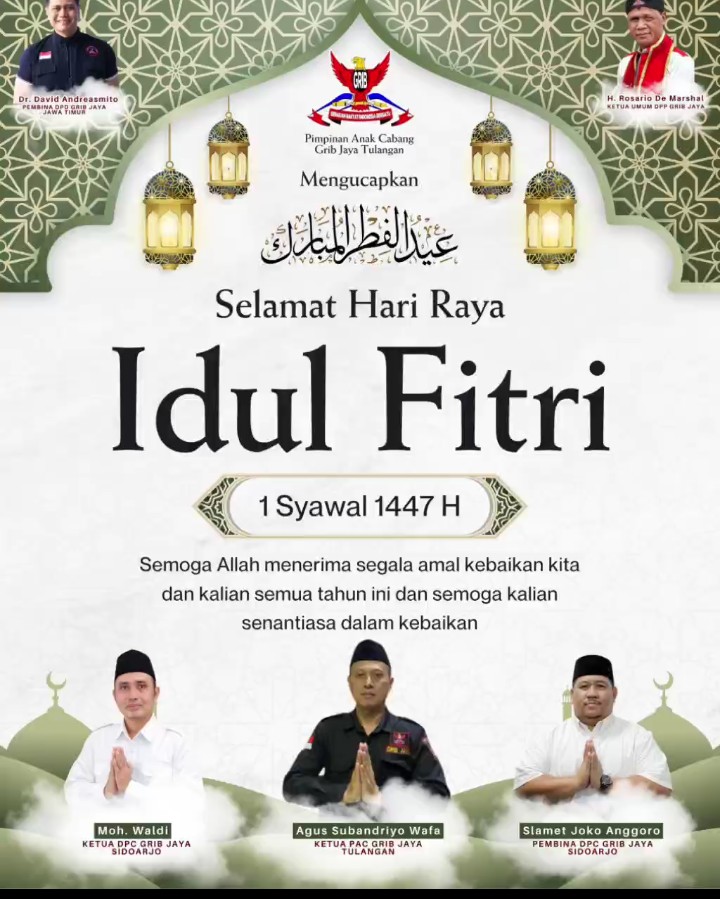 “Atas nama pribadi, keluarga, dan segenap jajaran PAC GRIB JAYA Tulangan, saya mengucapkan selamat Hari Raya Idul Fitri 1447 Hijriyah. Mohon maaf lahir dan batin,” tutur Agus Subandriyo dalam pernyataannya.