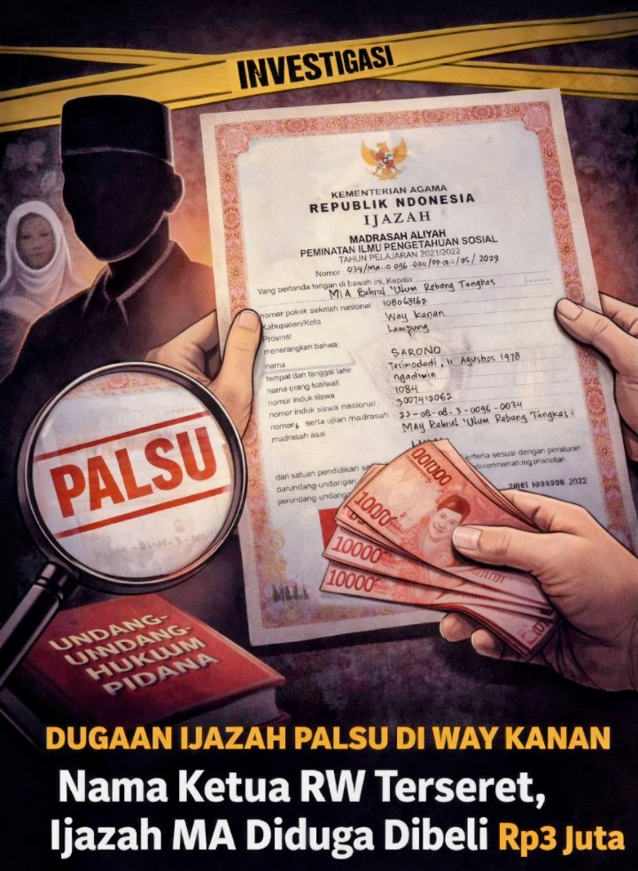 Way Kanan, Lampung//Pusatberita.i.news.Site Masyarakat Kabupaten Way Kanan tengah dihebohkan dengan munculnya dugaan ijazah bermasalah yang diduga tidak diperoleh melalui prosedur pendidikan yang sah. Sorotan publik mengarah pada ijazah Madrasah Aliyah (MA) yang tercatat atas nama Sarono, seorang tokoh yang pernah menjabat sebagai Ketua RW di Kampung Lebak Peniangan, Kecamatan Rebang Tangkas.
