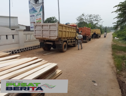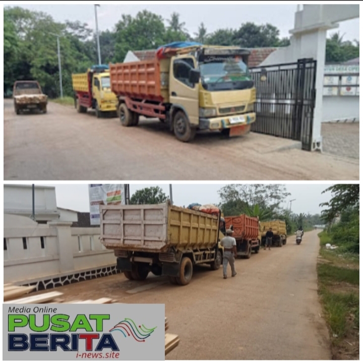 Banyaknya Truk Bermuatan Matrial yang Melintasi depan Kantor Desa Cipecang, membuat jalan menjadi Kotor dan Berdebu.