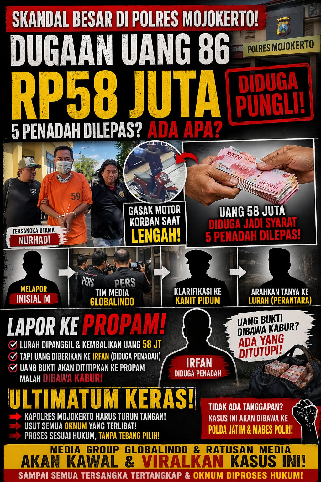 MOJOKERTO//pusatberita.i.news.site Tekanan publik terhadap penanganan kasus pencurian sepeda motor di wilayah Mojokerto kian menguat. Perkara yang awalnya hanya menyangkut tindak pidana curanmor kini berkembang menjadi sorotan serius, menyusul munculnya dugaan praktik “uang 86” senilai Rp58 juta yang diduga berkaitan dengan pelepasan sejumlah terduga penadah.
